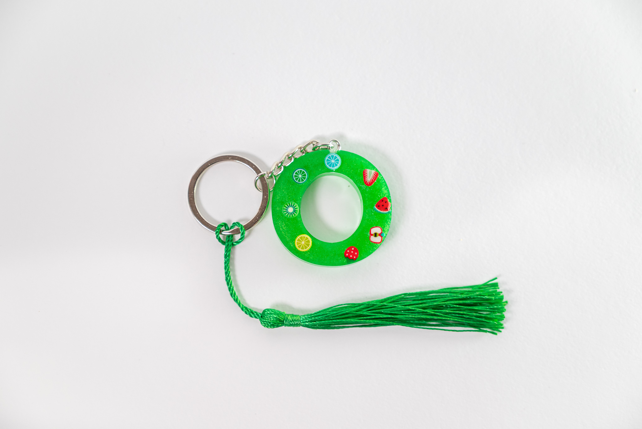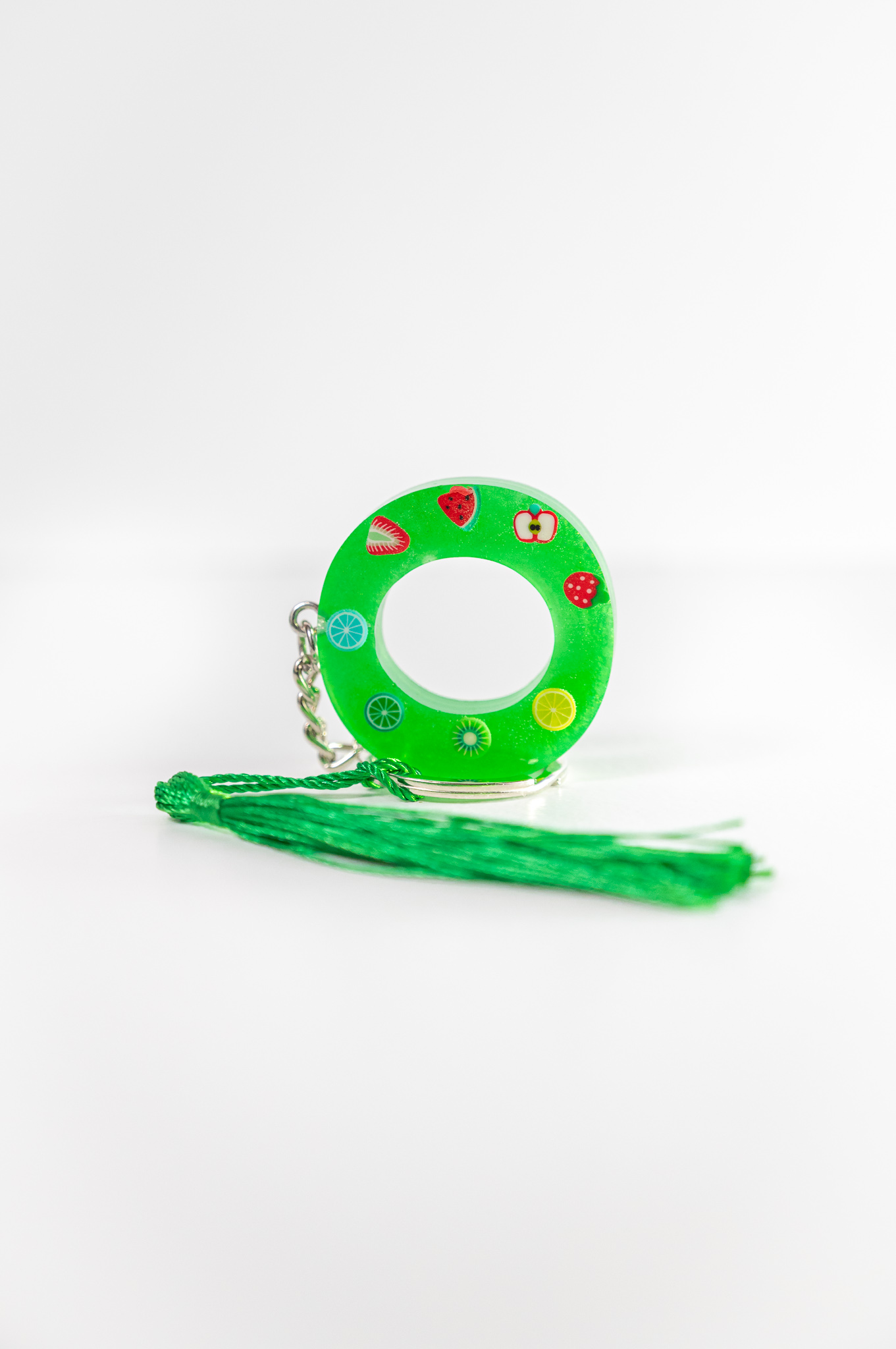 Χειροποίητο μπρελόκ από υγρό γυαλί με μονόγραμμα και διακοσμητικά φρουτάκια. Φρέσκο, καλοκαιρινό και μοναδικό δώρο!