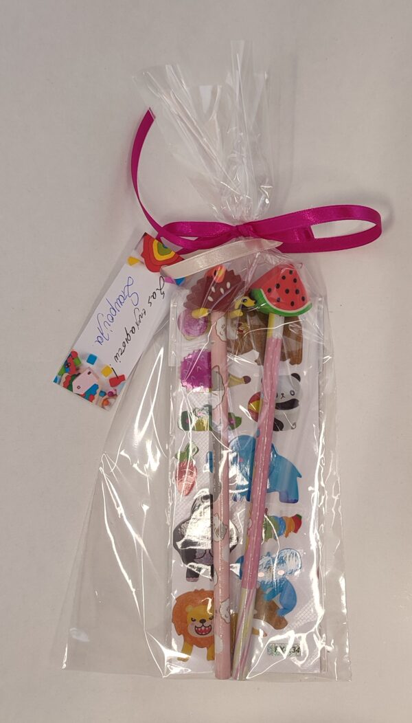 Το σετ περιλαμβάνει 2 μολυβάκια με γόμα σε τυχαίο χρώμα, τυχαία επιλογή καρτέλα με αυτοκόλλητα και καρτελάκι με το όνομα του παιδιού που έχει γενέθλια.