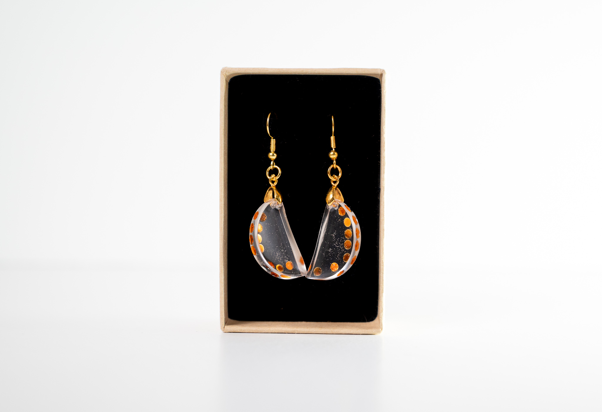 Λάμψη και κομψότητα σε κάθε σου εμφάνιση με αυτά τα χειροποίητα σκουλαρίκια σε σχήμα μισοφέγγαρου, διακοσμημένα με χρυσά στρας.
