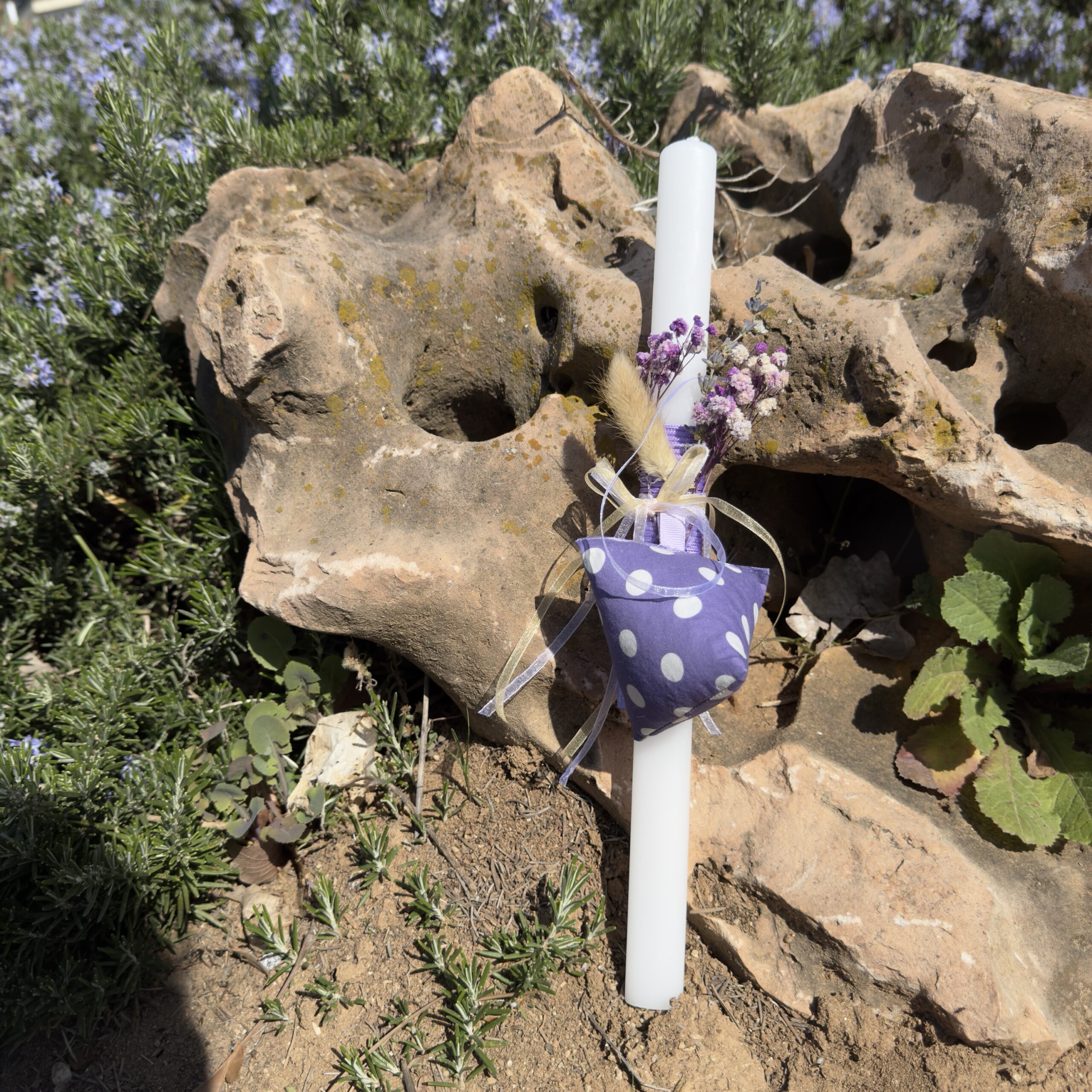Πασχαλινή λαμπάδα με χειροποίητο μαξιλαράκι λεβάντας σε ακανόνιστο σχήμα. Φυσικό άρωμα για ντουλάπες και συρτάρια.